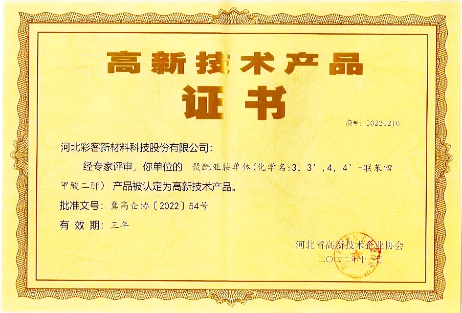河北彩客新材料科技股份有限公司是一家專注于高性能精細(xì)化工產(chǎn)品研發(fā)、生產(chǎn)及銷售的高新技術(shù)企業(yè),主要產(chǎn)品為高性能有機(jī)顏料中間體(DMSS、DATA、DMS、DIPS)、食品添加劑中間體 DMAS、新材料聚合單體 BPDA 等。